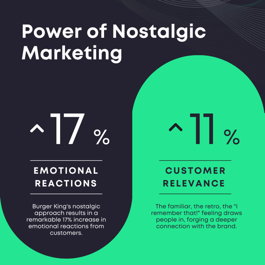 - We all get that nostalgic vibe whenever we hear the old-school slogan “Have it your way.” Burger King has used this nostalgic marketing efficiently by bringing back one of their earliest slogans, which later on helped them to gain an audience. There has been research on nostalgic marketing in which it was indicated that such things could boost customer relevance and manage to get emotional reactions from customers by 11% and 17%, respectively.